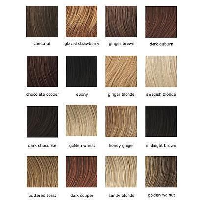 - EBONY R2 - MIDNIGHT BROWN R4 - DARK CHOCOLATE R6 - CHOCOLATE COPPER R6/30H - GOLDEN WALNUT R8/25 - GINGER BROWN R8/30 - CHESTNUT R10 - SANDY BLONDE R21T - SWEDISH BLONDE R22 - GINGER BLONDE R25 - GLAZED STRAWBERRY R29S - DARK AUBURN R33 - DARK COPPER R130 - HONEY GINGER R14/25 - GOLDEN WHEAT R14/88 - BUTTERED TOAST R1416
