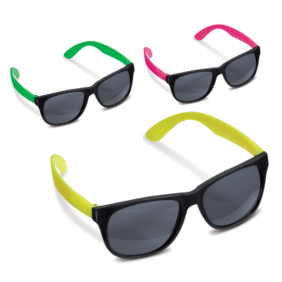 Zonnebrillen in het zwart met neon kleurige poten. De zonnebrillen worden assorti kleur geleverd. Afmeting bril: 14 x 14 x 4,8 cm. Gewicht: 18 gram.