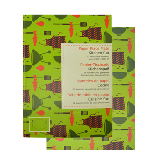 Papieren placemats in boek. De placemats hebben een keuken print. In het boek zitten 32 papieren placemats die je uit het boek kan scheuren. Afmeting boek: 30 x 0,5 x 42 cm. Afmeting placemat: 32 cm x 40 cm. Gewicht: 475 gram.