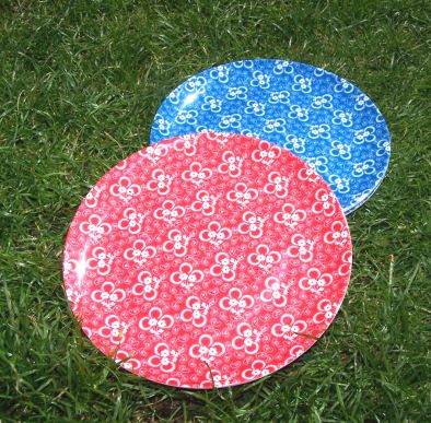 Bordjes van melamine met leuke rode en blauwe print. $ stuks van elke kleur.