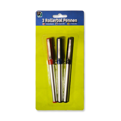 Drie rollerbal pennen in de kleuren rood, blauwe en zwart op kaart.
