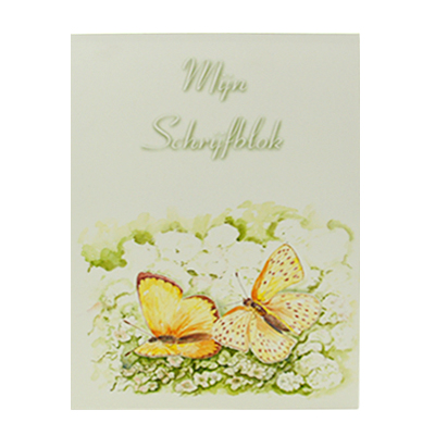 Schrijfblok vlinder.Het blok bevat lijntjes papier en elke bladzijde heeft links onderaan 3 vlinders staan.Afmeting schrijfblok: 21 x 0,5 x 30 cm.Gewicht: 280 gram.