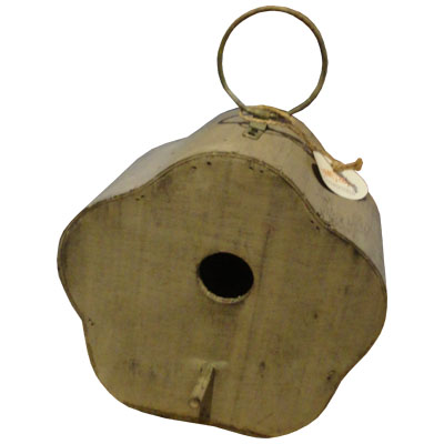 Houten vogelhuis in de vorm van een bloem. Afmeting (inclusief hengsel): 20,5 x 12 x 30 cm.