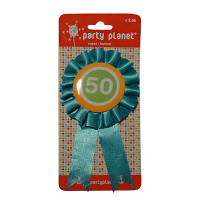 Blauwe rozet met een oranje/groene button met 50 erop.
