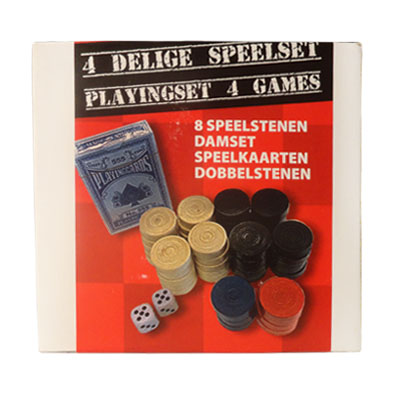 Een 4-delige speelsetHet doosje bevat: 8 speelstenen, damset, speelkaarten en dobbelstenen.Inclusief barcodeAfmeting: 9 x 6 x 9,5 cm.Gewicht: 278 gram.