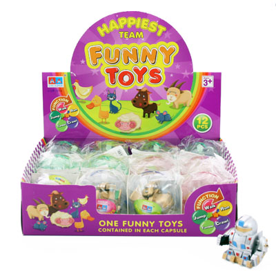 Funny toys robot in plastic bol. De figuren hebben verschillende functies, zoals: lopen, springen, kruimpen etc. De robot moet je even opdraaien en deze kan bewegen. Het artikel wordt assorti kleur geleverd: goud en zilver. Afmeting robot: 4,5 x 4 x 5,5 cm. Afmeting display: 26 x 19,5 x 7 cm. Gewicht: 42 gram.