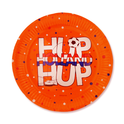 Kartonnen Holland bordjes. De bordjes zitten per 8 stuks verpakt. De bordjes zijn oranje en voorzien met de tekst "Hup Holland Hup". Afmeting: hoogte: 2,4 x doorsnee: 23 cm. Gewicht: 136 gram.