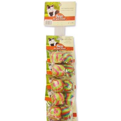 Kattenspeelgoed, kleine gekleurde balletjes.. Het speelgoed wordt geleverd met een hang display waar het speelgoed handig en goed op gepresenteerd kan worden. Afmeting hang display: 79 x 12,5 cm Afmeting speelgoed in zakje: 14 x 11 x 4 cm. Afmeting speelgoed balletje: doorsnee 4 cm. Gewicht totaal set: 160 gram.