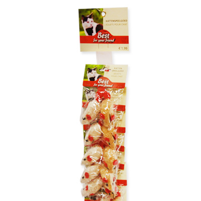 Kattenspeelgoed, kleine witte en bruine pluche muisjes. Het speelgoed wordt geleverd met een hang display waar het speelgoed handig en goed op gepresenteerd kan worden. Afmeting hang display: 79 x 12,5 cm Afmeting speelgoed in zakje: 15 x 11 x 3 cm. Afmeting speelgoed muisje (exclusief staart): 7 x 3,5 cm. Gewicht totaal set: 160 gram.