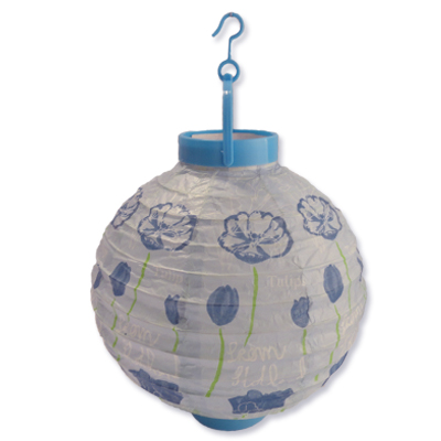 Papieren lampion met licht in het blauw met opdruk van tulpen. De lampion werkt op 2 AAA batterijen (niet mee geleverd). Afmeting lampion (exclusief hengsel): hoogte: 23 cm x doorsnee: 20 cm. Afmeting verpakking: 26 x 22 x 2,5 cm. Gewicht: 50 gram.