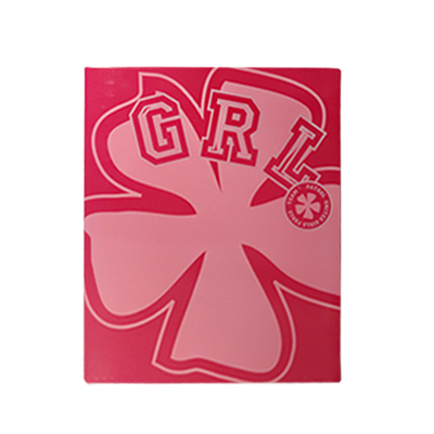Roze klapper met een licht roze bloem met de tekst "GRL".