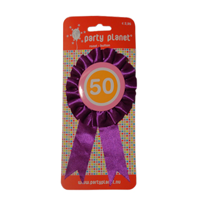 Paarse rozet met een oranje/roze button met 50 erop.Afmeting verpakking: 9,5 x 1 x 21,5 cm.Afmeting rozet: 9 x 1 x 17,5 cm. Gewicht: 22 gram.