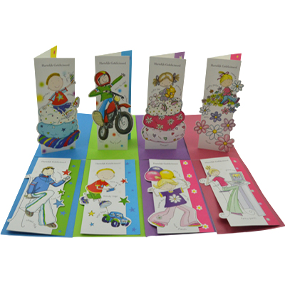 Wenskaart Hartelijk gefeliciteerd.Er zitten 16 modellen in een doos x 10 stuks.Afmeting: 13,5 x 0,1 x 23 cm.Gewicht: 20 gram.