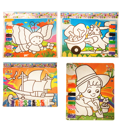 Kleurplaten met gekleurd zand. Haal de stickers van de kleurplaten en wees creatief met kleur! De zandkleurplaten worden assorti model geleverd. Afmeting verpakking: 31,5 x 22 x 0,1 cm. Afmeting kleurplaat: 27,5 x 20,5 x 0,1 cm. Gewicht: 26 gram.