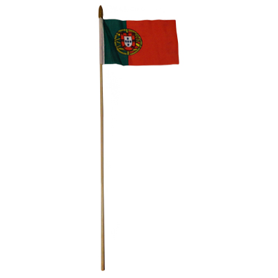 Stoffen zwaaivlaggetjes met de Portugese vlag.De vlag zit aan een houten stokje van ongeveer 50 cm bevestigd.Afmeting vlag: lengte: 16 x hoogte: 10 cm.Gewicht: 8 gram.