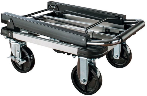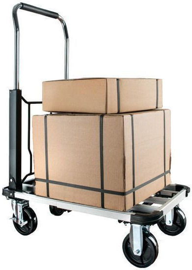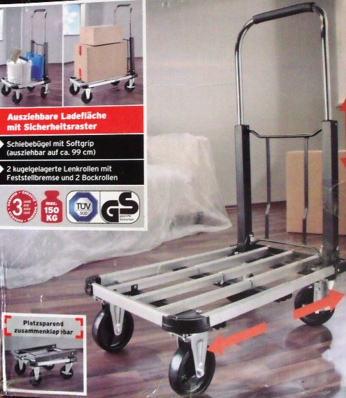 Productkenmerken: > Draagvermogen: 150 kg > Laadvlak uitschuifbaar: 420/630x410 mm (lxb) > Laadvlakhoogte: 200 mm > Laadvlak materiaal: geanodiseerd aluminium, hoeken voorzien van kunststof stootblokken > Uitw. afm. uitgeklapt: 710x410x990 mm (lxbxh) > Uitw. afm. ingeklapt: 560x410x270 mm (lxbxh) > Duwbeugel: opklapbaar, uitschuifbaar tot 990 mm, beugel verchroomd met softgrip > Wielen: 2 bok- en 2 zwenkwielen met rem, ø100x25 mm, massief streeploos rubber, kogelgelagerd > Aanlevering: gemonteerd in stevige doos (alleen nog snelle en eenvoudige montage van de zwenk- en bokwielen) > Gewicht: 8,6 kg