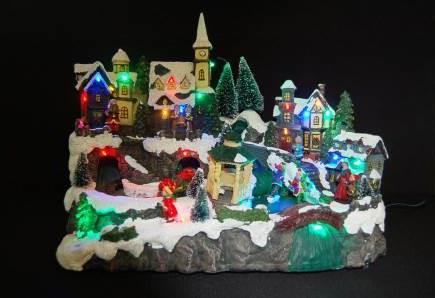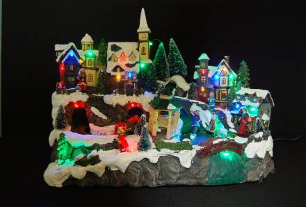 Dit prachtige kerstdorp heeft beweging , gekleurde ledlampjes en muziek . Per stuk verpakt in een doos en 2 stuks in een overdoos . Werkt op een adapter (inclusief)