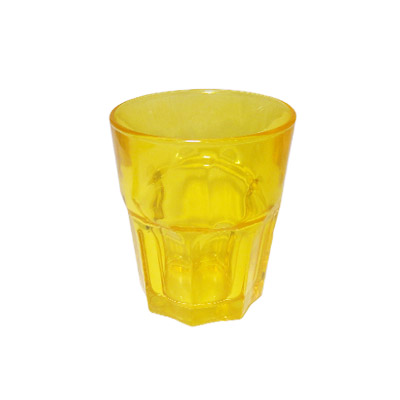 Drinkglas in het geel.Afmeting: hoogte: 10 cm x doorsnee: 8,5 cm.Gewicht: 280 gram.