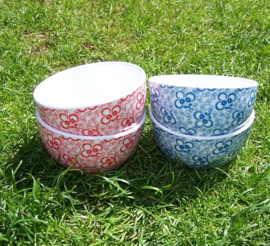 Kom van melamine met rood of blauw printje. Van beide kleuren slechts 2 op voorraad.