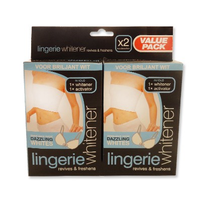 Lingerie whitener. Deze oxy dual action formulie maakt lingerie weer briljant wit. De BH's, slips en onderboeken worden weer als nieuw. Elke verpakking bevat voldoende voor een behandeling van 5-8 stukken ondergoed. Op de achterkant van de verpakking staat de gebruiksaanwijzing duidelijk uitgelegd. Afmeting verpakking: 18,2 x 3 x 18 cm. Gewicht: 190 gram.