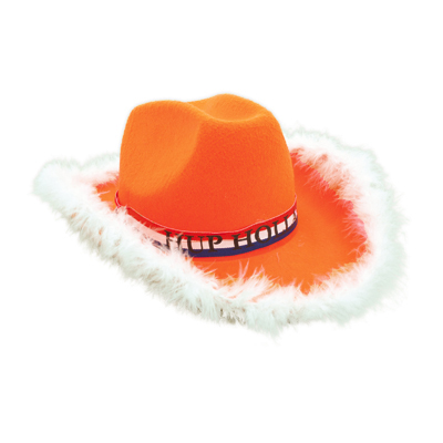 Oranje cowboy hoed met de tekst "Hup Holland".De hoed is geschikt voor volwassenen.Afmeting: 38 x 29 x 14 cm.Gewicht: 84 gram.