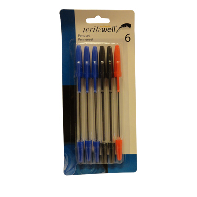 6 delige pennenset. De pennenset bestaat uit blauw-,zwart- en rood schrijvende pennen. Afmeting: 22 x 10 x 2 cm.