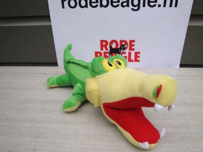 Deze pluche krokodil heeft een grappige grote kop en een klein lijf.