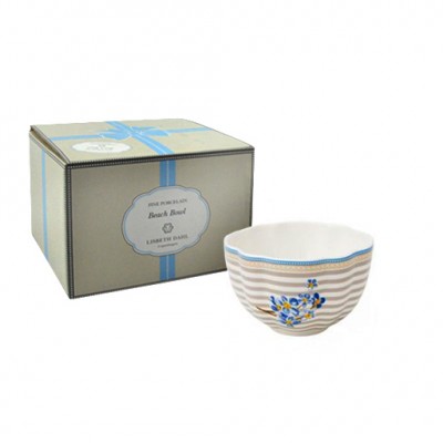 Gestreepte porseleinen schaal Beach met bloemen van het merk Lisbeth Dahl.Afmeting verpakking: 15,5 x 15,5 x 11 cm.Afmeting schaal: hoogte: 7,5 cm x doorsnee: 12 cm.Gewicht: 460 gram.