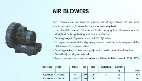 Nieuwe professioneel airblower model v5 1,50kw tri spotprijs spotprijs airblower proffesionele blower kan als afzuig installatie of luchtcompressor werken. Ze zijn ontworpen voor continue gebruik. Nieuwprijs 1523 euro marktplaatsprijs 895 euro nog 1 stuks op voorraad